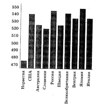 На диаграмме показан средний балл участников 10 стран в тестировании учащихся 4-го класса по естествознанию в 2007 году (по 1000-балльной шкале). По данным диаграммы найдите число стран, в которых средний балл участников не меньше чем 525.