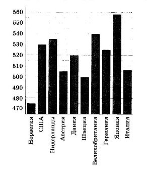 На диаграмме показан средний балл участников 10 стран в тестировании учащихся 4-го класса по математике в 2007 году (по 1000-балльной шкале). По данным диа¬граммы найдите число стран, в которых средний балл ниже, чем в Нидерландах.