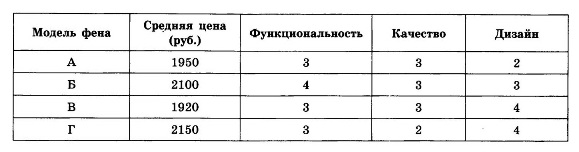 Рейтинговое агентство определяет рейтинг соотношения «цена — качество» электрических фенов для волос. Рейтинг вычисляется на основе средней цены Р и оценок функциональности F, качества Q и дизайна D. Каждый отдельный показатель оценивается экспертами по 5-балльной шкале целыми числами от 0 до 4. Итоговый рейтинг вычисляется по формуле R = 3(F + Q) + D - 0,01Р . В таблице даны оценки каждого показателя для нескольких моделей фенов. Определите, какая модель имеет наименьший рейтинг. В ответ запишите значение этого рейтинга.