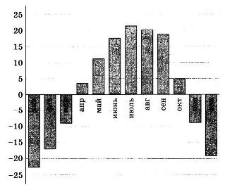 На диаграмме показана среднемесячная температура воздуха (в градусах Цельсия) в Хабаровске по результатам многолетних наблюдений. Найдите по диаграмме количество месяцев, когда среднемесячная температура в Хабаровске больше 5°С.