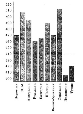 На диаграмме показан средний балл участников 10 стран в тестировании учащих¬ся 8-го класса по математике в 2007 году (по 1000-балльной шкале). Среди ука¬занных стран десятое место принадлежит Индонезии. Определите, какое место занимает Болгария.