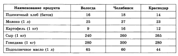 В таблице указаны средние цены (в рублях) на некоторые основные продукты пи¬тания в трёх городах России (по данным на начало 2010 года). Определите, в каком из этих городов окажется самым дешёвым следующий набор продуктов: 2 кг картофеля, 1 кг сыра, 1 л подсолнечного масла. В ответ запишите стоимость данного набора продуктов в этом городе (в рублях).
