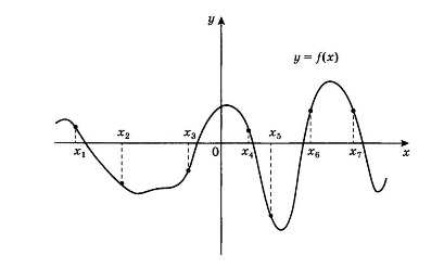 На рисунке изображён график функции y = f(x). Найдите среди точек x1, х2, x3, х4, х6 и х7 те точки, в которых производная функции f(x) отрицательна. В от¬вет запишите количество найденных точек.