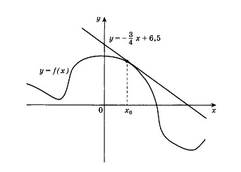 На рисунке изображены график функции y = f(x) и касательная к этому графику, проведённая в точке х0. Уравнение касательной показано на рисунке. Найдите значение производной функции у = 4f(x)-3 в точке x0.