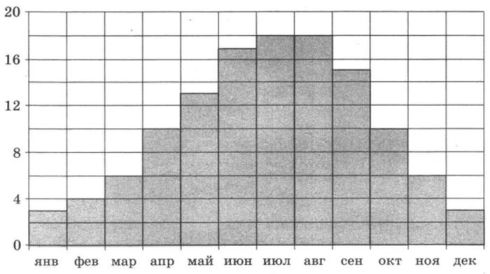 Ha диаграмме показана среднемесячная температура воздуха в Париже за каждый месяц 2009 года. По горизонтали указываются месяцы, по вертикали — температура в градусах Цельсия. Определите по диаграмме, сколько было месяцев в 2009 году, когда среднемесячная температура была равна 10 градусам Цельсия.![]() | |||