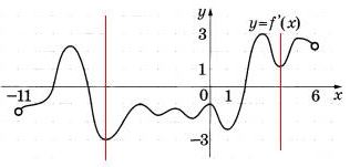 На рисунке изображён график у=f\'(x) — производной функции f(x), определённой на интервале (-11;6). Найдите количество точек минимума функции f(x) принадлежащих отрезку [-6;4].![]() | |||