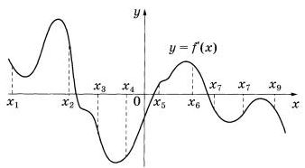 На рисунке изображён график у = f\'(x) — производной функции f(x). На оси абсцисс отмечены девять точек: . Сколько из этих точек лежит на промежутках возрастания функции f(x)?![]() | |||